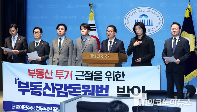 국회 정무위원회 여당 간사인 더불어민주당 강준현 의원과 정무위원들이 10일 국회 소통관에서 ‘부동산감독원 설치 및 운영에 관한 법률 제정안’과 ‘사법경찰직무법 개정안’ 발의 기자회견을 열고 “부동산 투기 공화국이라는 오명에 종지부를 찍겠다”고 밝혔다.
