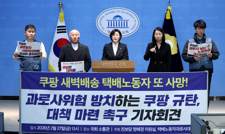정혜경 진보당 의원과 택배노동자과로사대책위원회는 27일 국회 소통관에서 기자회견을 열고 “과로사대책위와 택배노조가 지속적으로 문제를 제기했던 쿠팡의 클렌징과 SLA 즉, 높은 서비스 기준에 미달할 경우, 구역회수와 고용불안 때문이 명백하다”고 주장했다.