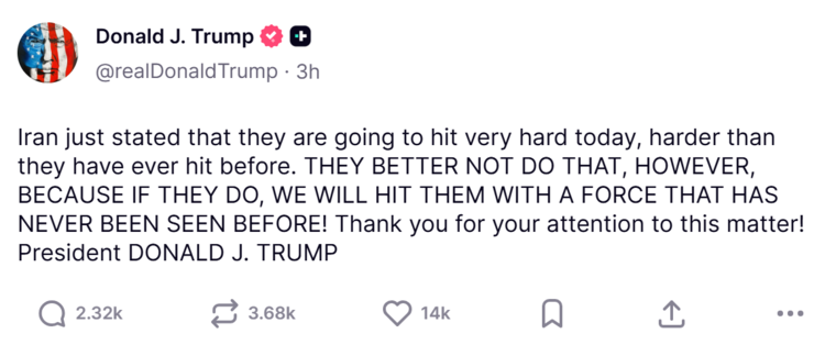 그는 1일(현지시간) 트루스소셜을 통해 강경한 메시지를 전했다. 그는 “이란이 오늘 전례 없이 강력하게 타격하겠다고 주장했다”면서 “하지만 그들이 그러면 그럴수록 우리도 그들에게 전에 없던 힘으로 타격할 것”이라고 강조했다.