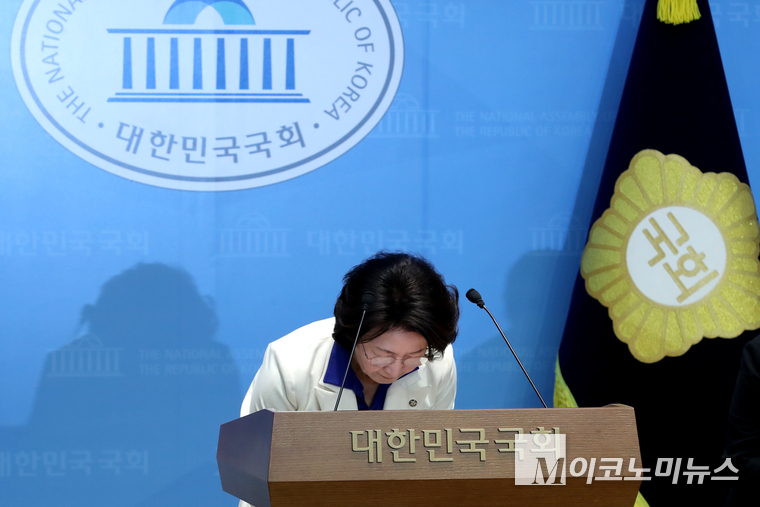 「M포토」 민주당 경기지사 후보 추미애, 국회 기자회견에서 인사