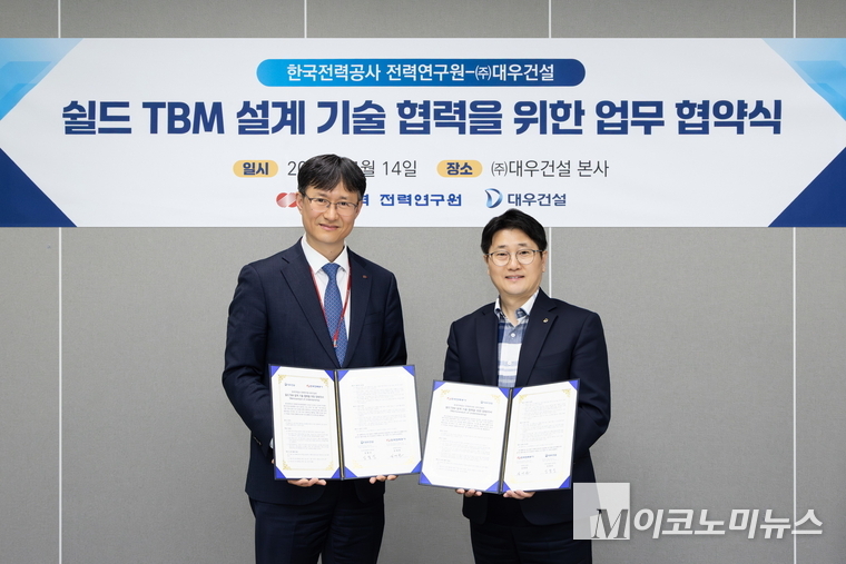 지난 14일 을지로 본사에서 열린 협약식에는 심철진 대우건설 토목사업본부장과 김대한 한전 전력연구원장 등 양사 주요 관계자들이 참석해 TBM 기술 개발 및 공동의 기술 경쟁력 확보를 위한 협력 방안을 논의했다.