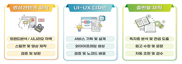 노동부는 지역인적자원개발위원회와 협업해 훈련생들이 직종별 전체 업무 흐름을 이해하고, 단계별로 적절한 AI 도구를 선택해 산출물을 생성·검증·보완할 수 있는 역량을 배양하는 과정을 마련했다. 이번 시범사업은 △영상콘텐츠 제작 △UI/UX 디자인 △출판물 제작 등 3개 직종을 대상으로 시작된다.
