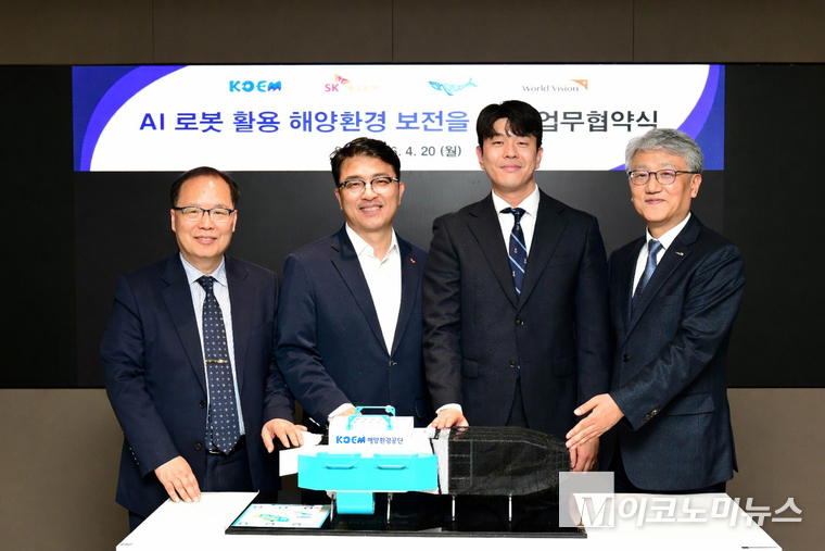 SK에코플랜트는 지난 20일 서울 종로구 수송동 본사에서 해양환경공단, ㈜쉐코, 월드비전과 ‘AI 해양정화 로봇 도입 및 미래세대 해양환경 교육’을 위한 다자간 업무협약(MOU)을 체결했다고 21일 밝혔다.