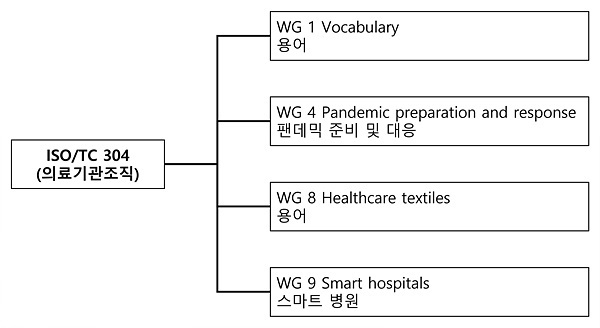 한편 ISO/TC 304(의료조직관리) 회원국은 P 회원국으로 △대한민국 △미국 △독일 △중국 △일본 등 29개국이, O 회원국으로 △네덜란드 △사우디아라비아 △프랑스 △체코 △호주 등 27개국이 참여하고 있다. 조직도는 4개의 WG(작업반)으로 구성됐다. 이 가운데 우리나라가 주도해 설립된 작업반은 WG 4(2020년 9월), WG 9(202년 12월) 등이다.