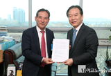 [M포토] 정태호 민주당 의원에게 '정책건의서' 전달하는 정재현 전 의장