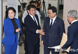 「M포토」 기자회견 전 대화하는 서삼석 의원