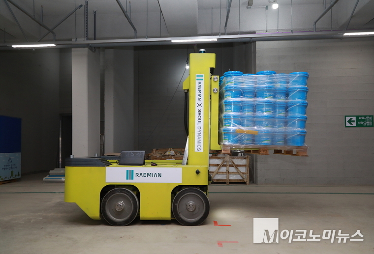 서울다이나믹스의 자율주행 지게차와 자재 이동 로봇은 현장에서 작업이 없는 야간에 자재를 자동으로 운반한다. 자율주행으로 현장에 야적된 팔레트를 인식해 자재를 지하의 아파트 각 동 별 지정된 장소로 운반한다. 이후 자재 이동 로봇은 분배된 자재를 싣고 엘리베이터를 호출하고 탑승해 아파트 호실 내부까지 운반·하역한다.