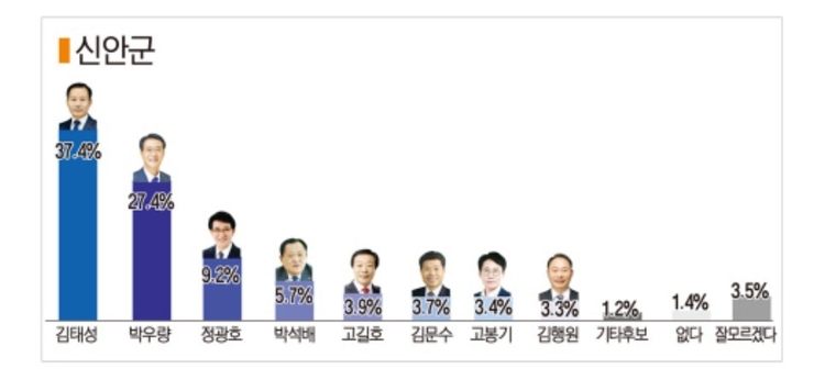 ◇ 신안군수...김태성(37.4%) 굳건한 1위 속 박우량 바짝 추격