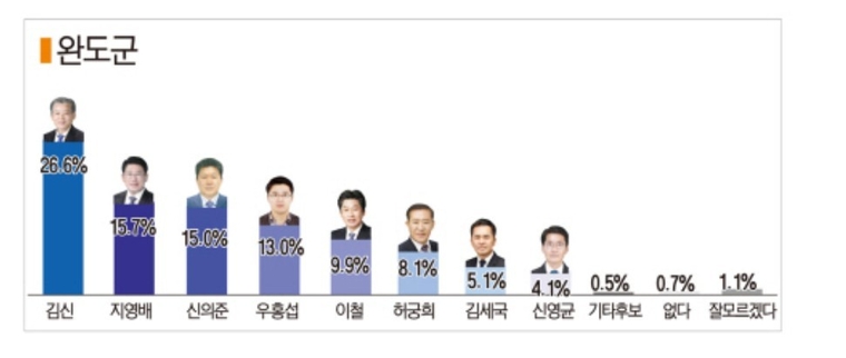 차기 완도군수 후보 지지도에서는 김신 전 완도군의원이 26.6%로 선두를 달렸고, 지영배 호남대 특임교수가 15.7%, 신의준 전남도의원은 15.0%, 우홍섭 전 진도 부군수는 13.0%를 기록했다.