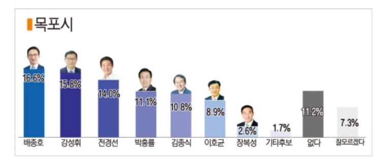 KBS에서 뉴욕 특파원을 지낸 배종호 세한대 교수는 차기 목포시장 후보 지지도에서 16.6%로 가장 높은 지지율을 보였다. 강성휘 전 전남도의원(15.8%)과 전경선 전남도의원(14.0%)은 각각 0.8%p, 2.6%p 차이로 배 교수를 맹추격하고 있다.