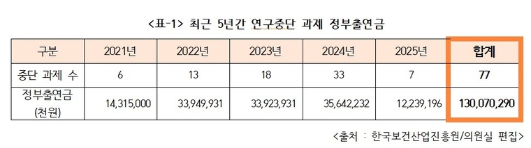 이주영 개혁신당 국회의원(보건복지위원회/비례대표)이 한국보건산업진흥원(이하 진흥원)으로부터 제출받은 자료에 따르면 진흥원이 지원한 R&D 과제 중 최근 5년간 중단된 연구과제 77개에 지급된 정부출연금은 1300억 원, 제재처분을 받은 18개의 정부출연금은 126억 원이었던 것으로 드러났다.