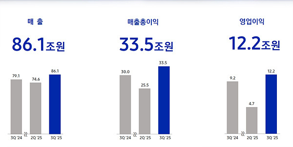 삼성전자가 연결 기준으로 매출 86조1000억원, 영업이익 12조2000억원의 2025년 3분기 실적을 발표했다. 전사 매출은 전분기 대비 15% 증가하며 역대 최대 분기 매출을 기록했다.