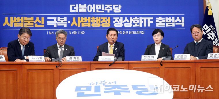 정청래 대표는 이날 국회 본관에서 열린 ‘사법불신 극복 사법행정 정상화 TF’ 공식 출범식에서 “헌법과 법률이 정한 절차에 따라 공평하게 수사받고 편향 없는 재판을 받는 나라, 법과 양심이 재판의 유일한 기준이 되는 사법 시스템을 바라는 것”이라며 이같이 말했다.