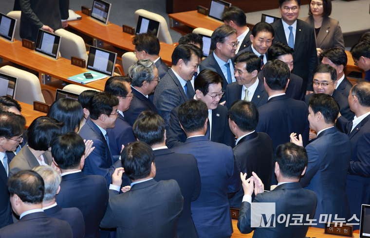「M포토」 민주당 의원들의 환영 받는 李대통령