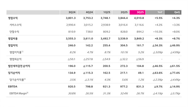 LG유플러스는 올해 3분기 연결재무제표 기준 영업수익 4조108억원, 서비스수익(영업수익에서 단말수익을 제외한 매출) 3조1166억원, 영업이익 1617억원을 기록했다. 영업수익과 서비스수익은 모바일 부문의 성장세에 힘입어 각각 전년 동기대비 5.5%, 4.2% 늘어났다. 또 전사 AI Agent 확산 적용을 통한 업무 효율화 및 생산성 향상, AIDC(AI데이터센터) 사업의 가시적인 성과 등도 견조한 실적의 배경으로 지목된다.
