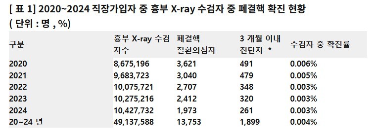 더불어민주당 김윤 의원(국회 보건복지위원회, 비례대표)이 국민건강보험공단으로부터 제출받은 자료를 분석한 결과, 2020년부터 2024년까지 직장가입자의 흉부 X-ray 수검자 중 3개월 이내 폐결핵 진단률은 평균 0.004%에 불과한 것으로 나타났다.