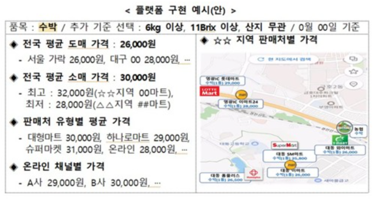 정부는 'AI 농산물 알뜰 소비정보 플랫폼'을 만들어 농산물 가격 동향을 제공하고 소비자 위치에 기반한 최적 구매처를 제시하거나 일시적으로 가격이 뛴 식재료의 대체품을 추천한다고 밝혔다.