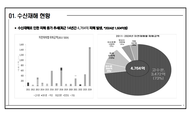 국립수산과학원 보고서에 따르면, 2011~2024년까지 14년 간 누적 수산 재해 피해액 4,764억 원 중 고수온 피해 금액은 3,472억 원으로 약 3/4을 차지한다. 지난해 장기간 폭염과 고수온 현상이 발생해 양식업에선 총 1,430억 원의 손실이 발생했다. 2018년 이후 최대 규모의 양식업 피해다. 이는 전년의 3배 이상 규모로 양식업의 고수온 피해 집계를 시작한 2012년 이후 최대다.