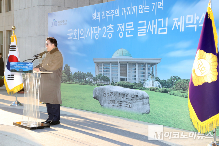 우원식 의장은 이날 “민의의 전당인 이곳 국회의사당 정문에 1948년 제헌 이래로 단 한 번도 바뀌지 않은 우리 헌법의 첫 구절을 새겨 넣는다”며 “모든 권력은 국민으로부터 나온다, 이는 정치와 국회가 매사, 매 순간 새겨야 할 경구”라고 강조했다.