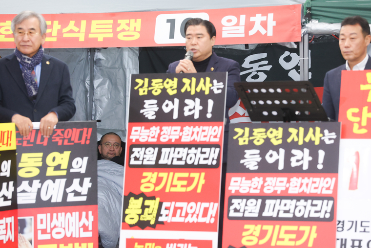 국민의힘은 앞서 민생예산 삭감에 반발하며 농성에 들어간 상태로, 백현종 대표가 단식 10일째를 이어가고 있다고 설명했다.