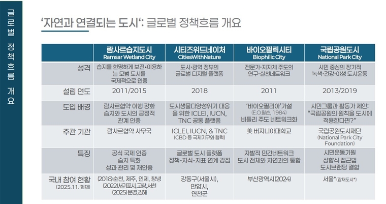 시티즈위드네이처(Cities with Nature)는 서울 강동구·안양·연천군이 바이오필릭시티(Biophilic City,)에는 부산광역시(2024)가 국립공원도시(National Park City)는 공식 지정 도시는 없으나 서울·도쿄가 ‘잠재 도시’로 국제지도에 이름을 올린 상태다.