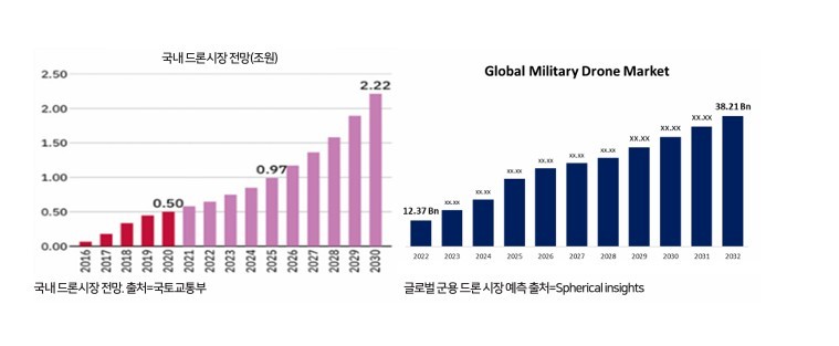 글로벌 군용 드론 시장은 꾸준히 그 수요 및 규모가 증가하고 있으며, 연평균성장률은 2022년부터 2032년까지 11.9%를 기반으로 2032년엔 300억 달러에 이를 것으로 추정된다. 민간 측면에서의 글로벌 드론 시장 또한 가파르게 성장하고 있다. 2024년에는 603억7000만 달러였으며, 2034년에는 약 1조4458억 달러에 도달할 것으로 연평균 성장률 37%로 확대될 것으로 전망된다.