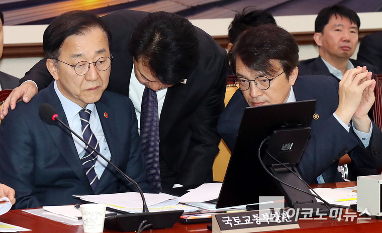 「M포토」 국토위서 복기왕 의원과 대화하는 김윤덕 장관