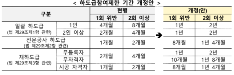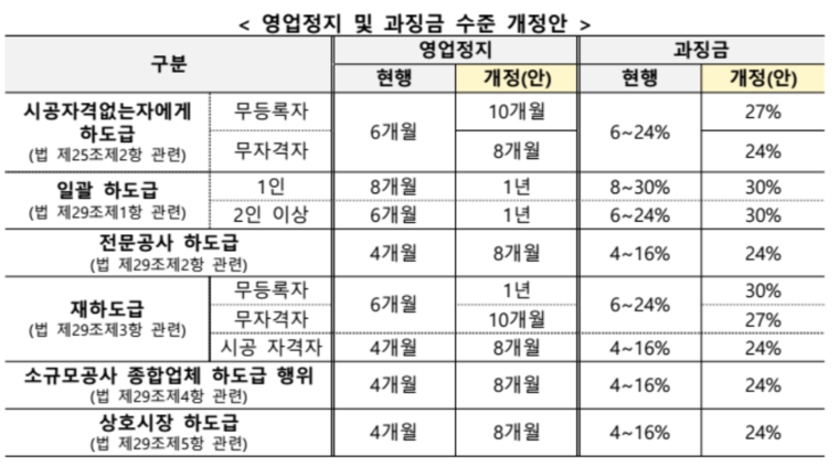 개정안에 따르면 불법하도급을 한 건설사업자에 대한 행정처분 수준이 현행 대비 큰 폭으로 상향된다. 우선 영업정지 기간은 기존 4~8개월에서 최소 8개월에서 최대 1년까지로 강화된다.