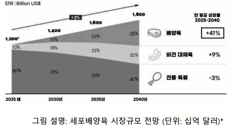 FAO 보고서에 따르면, 2025년부터 시작해 2040년 사이 세포배양육 성장률은 연평균 41%로 나타났다. 투자자들이 앞다퉈 뛰어드는 것처럼 보이나 해외 주요 기업들의 투자는 빠지고 있는 상황이다. 또 몇몇 회사는 자본잠식 상태인 경우도 있어 한국이 뒤늦게 뛰어들었다간 큰 손실로 이어질 수 있다는 우려가 나온다.