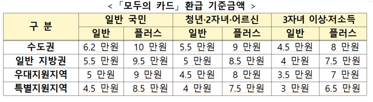환급 기준금액은 대중교통 인프라 여건을 고려해 지역별로 차등 적용한다. 지역은 수도권, 일반 지방권, 우대·특별지원지역 등 4개 유형으로 구분된다.