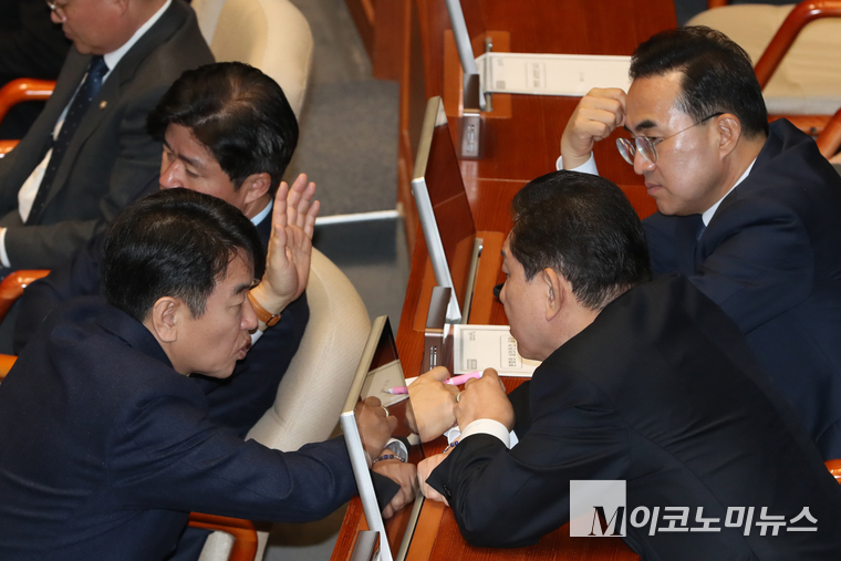 「M포토」 의원들과 논의하는 김병기 민주당 원내대표