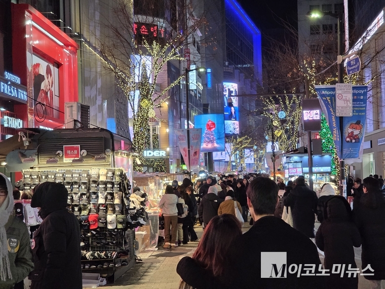 성탄절을 맞아 서울 명동 일대는 영하권의 매서운 추위에도 연말 분위기를 즐기려는 인파로 북적였다. 길거리 음식을 판매하는 노점 앞에는 줄을 서서 기다리는 시민들이 많았고, 곳곳에는 경찰 병력이 배치돼 "계속 이동하십시오'라며 쉼 없이 보행 흐름을 안내했다.