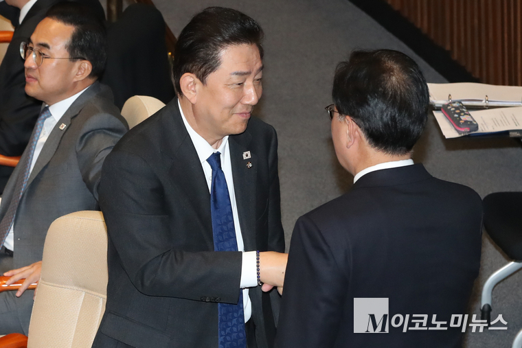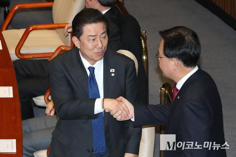 「M포토」 김병기 전 원내대표와 인사하는 송원석 국민의힘 원내대표
