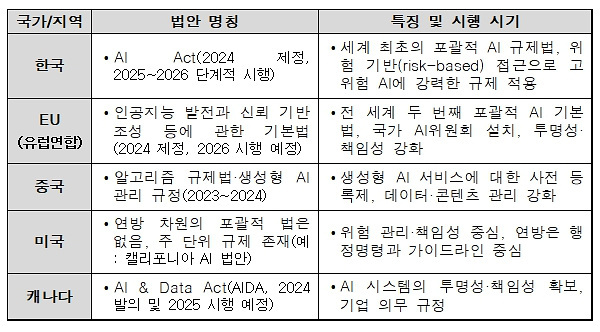 우리 정부가 마련한 ‘AI 기본법’은 EU의 법에 근거한 안전성 중심 규제와 미국의 혁신 중심 자율 규제 사이에서 보다 현실적인 균형점을 찾는데 방점을 찍고 있다. 대표적으로 ‘고영향 AI 지정 제도’, ‘생성형 AI 워터마크 의무’, ‘사전 규제보다 사후 관리’, ‘기존 법률과의 연계 강화’ 등에서 외국의 규제와는 차별점을 보이고 있다.