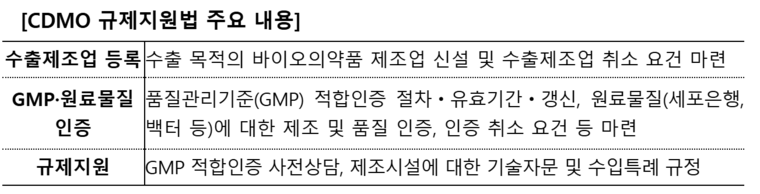 이에 따라 바이오의약품 수출제조업 등록제가 새로 도입된다. 식약처는 수출에 특화된 바이오의약품 제조소 시설 기준을 마련하고, CDMO 제조소에 대한 제조·품질관리(GMP) 적합인증 기준과 원료물질 인증 기준을 법적 근거에 따라 체계화할 계획이다.