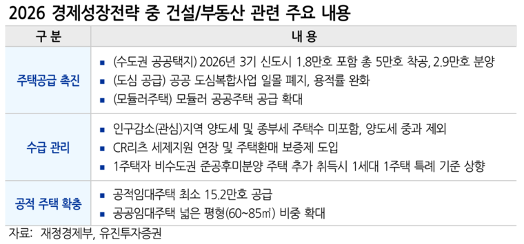12일 유진투자증권 ‘2026년 경제선장전략, 성장보다는 관리’ 리포트에 따르면, 정부의 이 같은 정책 방향에 대해 “건설 부진 완화가 성장률 가정에 일부 반영되기는 했지만, 공공 발주 확대나 SOC 투자 확대 등 건설투자를 직접 늘리겠다는 정책 신호는 제한적”이라고 진단했다.