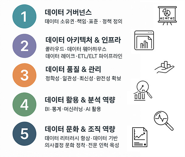 세 번째는 ‘데이터 품질과 관리’로, 정확성·일관성·최신성·완전성을 확보하고 메타데이터·마스터 데이터 관리(MDM)를 통해 신뢰할 수 있는 데이터를 만드는 과정이다. 네 번째는 ‘데이터 활용과 분석 역량’이며, BI·통계·머신러닝·AI 등을 활용해 비즈니스 문제를 해결하고 우선순위 높은 사용사례를 조직 전반으로 확산하는 것이 핵심이다.