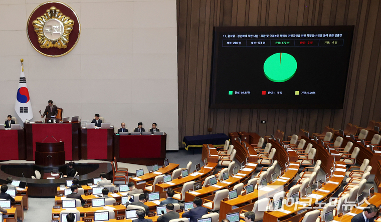 국회는 이날 오후 본회의를 열고 더불어민주당이 발의한 ‘윤석열·김건희에 의한 내란·외환 및 국정농단 행위의 진상 규명을 위한 특검 임명 등에 관한 법률안’을 가결했다. 2차 종합특검법은 재석 174명 가운데 찬성 172명, 반대 2명으로 통과됐다.