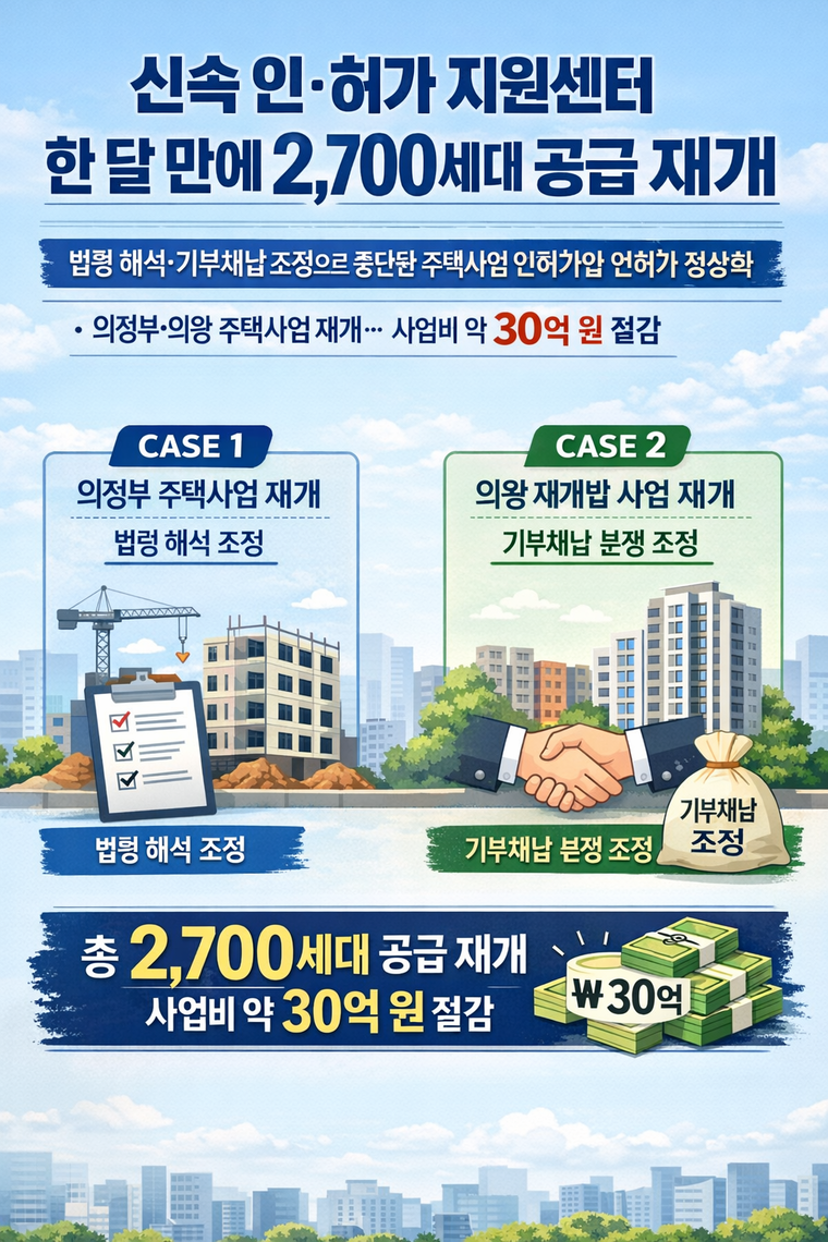 신속 인·허가 지원센터는 주택공급 확대방안의 후속조치로 마련된 기구다. 인·허가 과정에서 발생하는 법령 해석 혼선과 지방정부와 사업자 간 이견을 조정해 사업 지연에 따른 사업비 증가와 분양가 상승 문제를 완화하는 역할을 한다. 센터는 지난해 11월 말부터 인·허가 기관과 사업시행자를 대상으로 지원 신청을 받아 사안을 검토해왔다.