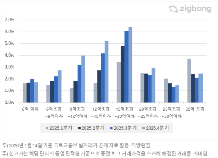 19일 직방이 국토교통부 실거래가 공개시스템 데이터를 분석한 결과, 30억원을 초과하는 서울 아파트 신고가 계약 비중은 지난해 1분기 3.7%에서 4분기 2.4%로 낮아졌다. 반면 9억원 초과~12억원 이하 아파트의 신고가 계약 비중은 같은 기간 1.2%에서 4.0%로, 12억원 초과~15억원 이하 아파트는 1.7%에서 5.2%로 각각 상승했다.