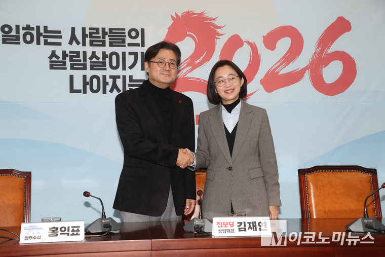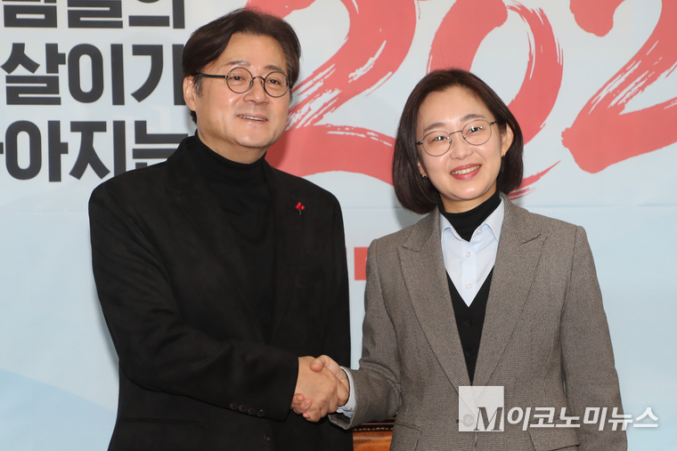 「M포토」 기념사진 촬영하는 홍익표·김재연