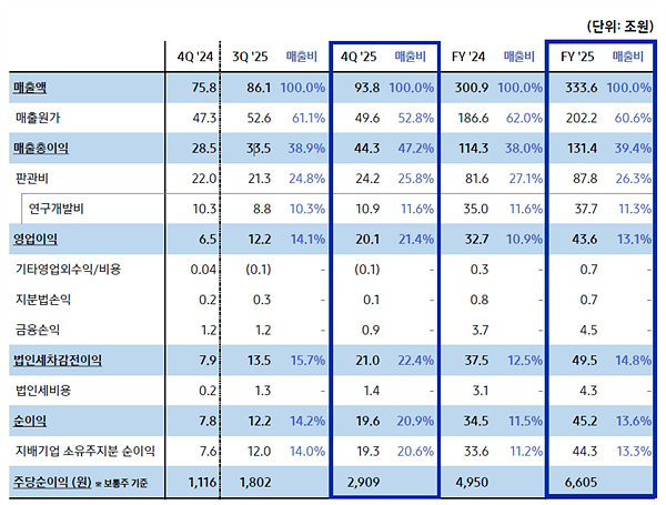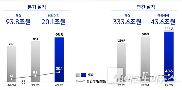 삼성전자가 지난해 4분기 매출 93조8000억원, 영업이익 20조1000억원(연결기준)의 실적을 냈다. 4분기에 회사는 DS(Device Solutions) 부문의 HBM(High Bandwidth Memory) 고부가제품 판매 확대와 메모리 가격 상승 등에 힘입어 역대 최대 분기 매출과 영업이익을 달성했다.