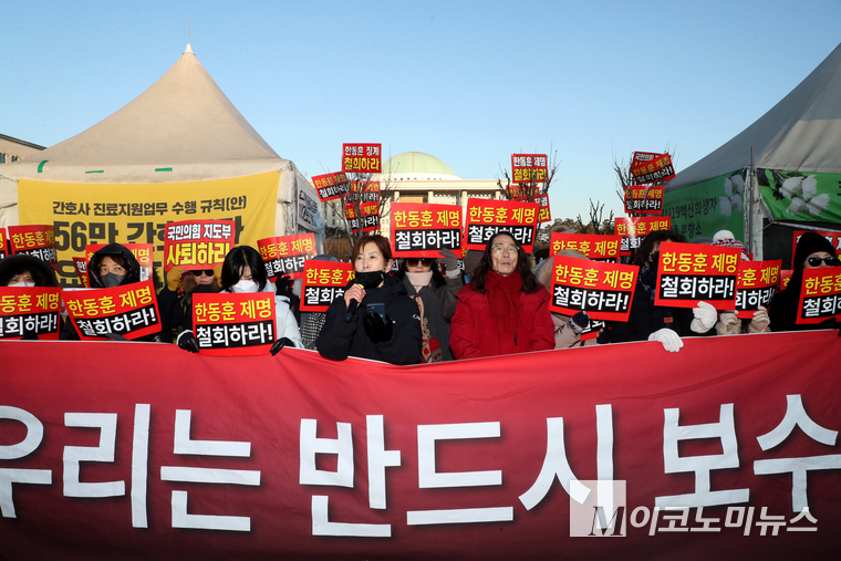 한 전 대표 지지자들은 29일 국회 앞에서 기자회견을 열고 “불법 계엄을 막아낸 당 대표를 징계하는 정당이 과연 민주 정당인가”라며 제명 철회를 촉구했다.