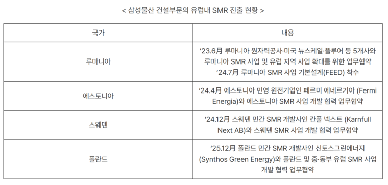 체르나보다 원전 사업 착공은 올 상반기로 기대된다. 업계에 따르면 해당 사업은 700메가와트(MW) 규모 대형 원전 2기를 건설하는 프로젝트로 총 EPC 규모만 150억 달러(약 21조7400억원)~200억 달러(약 28조9900억원)에 달하는 것으로 알려졌다. 이 외에도 삼성물산은 지난해 12월 11일 폴란드 민간 SMR 개발사인 신토스그린에너지와 유럽 SMR 개발 협력을 위한 업무협약을 체결했다. 이를 통해 중·동부 유럽 시장 SMR 사업 확장에 나선다.