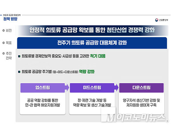 희토류 종합대책은 지난해 12월말 출범한 산업부 산업자원안보실 제1호 정책으로, 광산개발-분리·정제-제품생산까지 희토류 공급망 전 주기 대응체계 강화방안을 담았다. 대책의 주요내용은 첫째, 단기 수급위기 관리를 위해 다양한 채널을 통해 통상협력을 적극 확대하고, 희토류(17종) 전체를 핵심광물로 지정하며, 희토류 수출입코드(HSK코드) 신설·세분화 등을 통해 수급분석을 강화키로 했다. 둘째, 확보처 다각화를 위해 프로젝트 중심으로 자원외교를 강화하고, 민간의 투자 리스크 분담을 위해 공공의 역할을 강화한다. 올해 해외자원개발 융자 예산을 전년 390억원 대비 285억원 증액한 675억원으로 책정했고, 융자 지원비율을 기존 50%에서 70%까지 확대하는 등 정책금융 지원도 강화한다.