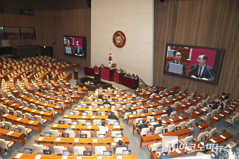 「M포토」 빈 의석 앞에서 대정부 질문 이어가는 김민석·주호영
