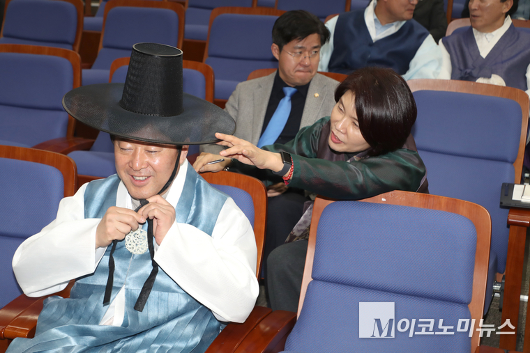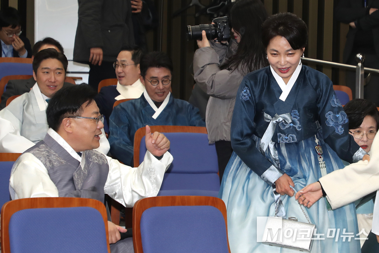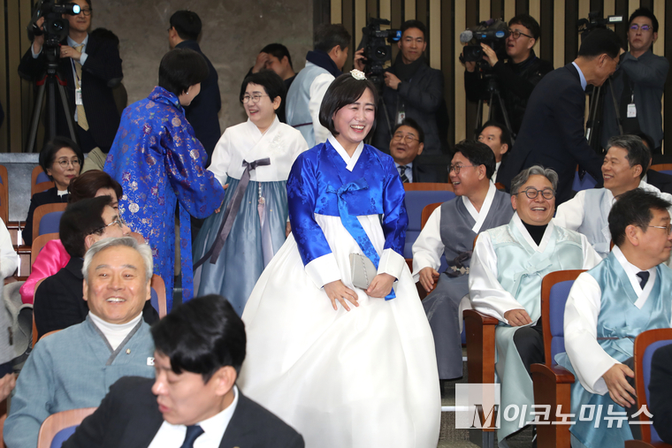 「M포토」 설 앞두고 한복 입고 의총 참석하는 민주당 의원들