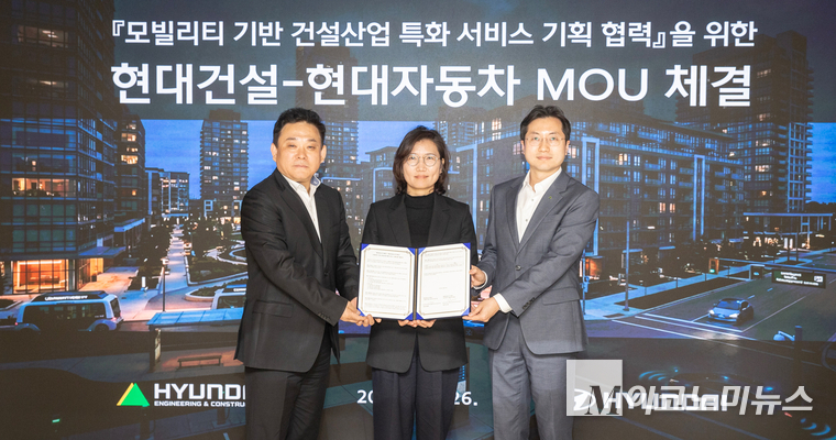 현대건설은 26일 서울 종로구에 위치한 현대건설 본사 사옥에서 현대자동차와 ‘모빌리티 기반 건설산업 특화 서비스 기획 협력’을 위한 업무협약(MOU)을 체결했다. 이날 행사는 현대건설 송명준 인프라도시연구실장과 오승민 브랜드전략실장, 현대자동차 김수영 모빌리티사업실장 등 주요 관계자들이 참석한 가운데 진행됐다.