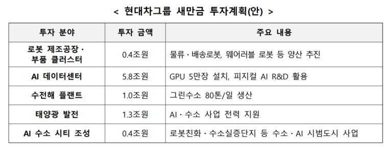 이번 투자계획의 핵심은 로봇 제조, 초대형 AI 인프라, 그린수소 생산, 재생에너지 기반 전력 공급, 수소 기반 미래도시 조성 등이다.