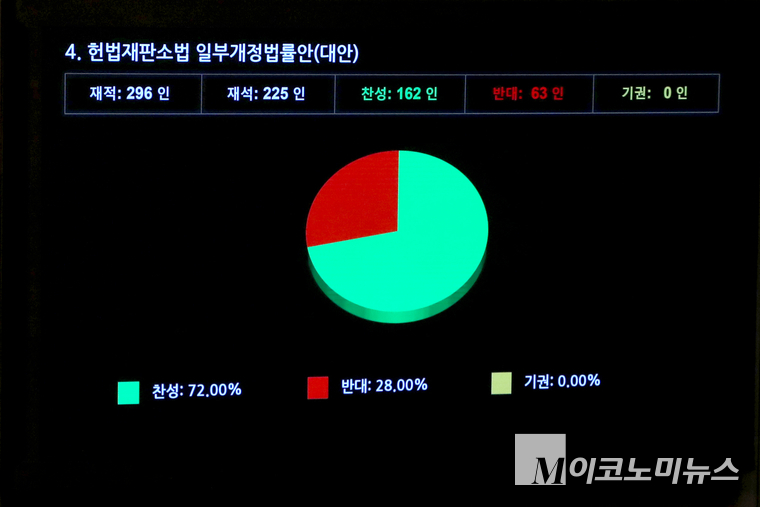 더불어민주당이 추진하는 ‘재판소원제법’(헌법재판소법 일부개정법률안)이 필리버스터(무제한토론) 끝에 27일 국회 본회의에서 재석 225명 중 찬성 162명, 반대 63명으로 가결 처리됐다.